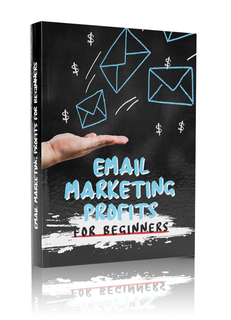 A book with the title Email Marketing Profits For Beginners with an image of a hand and hand drawn illustrations of envelopes and dollar signs